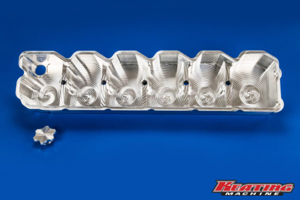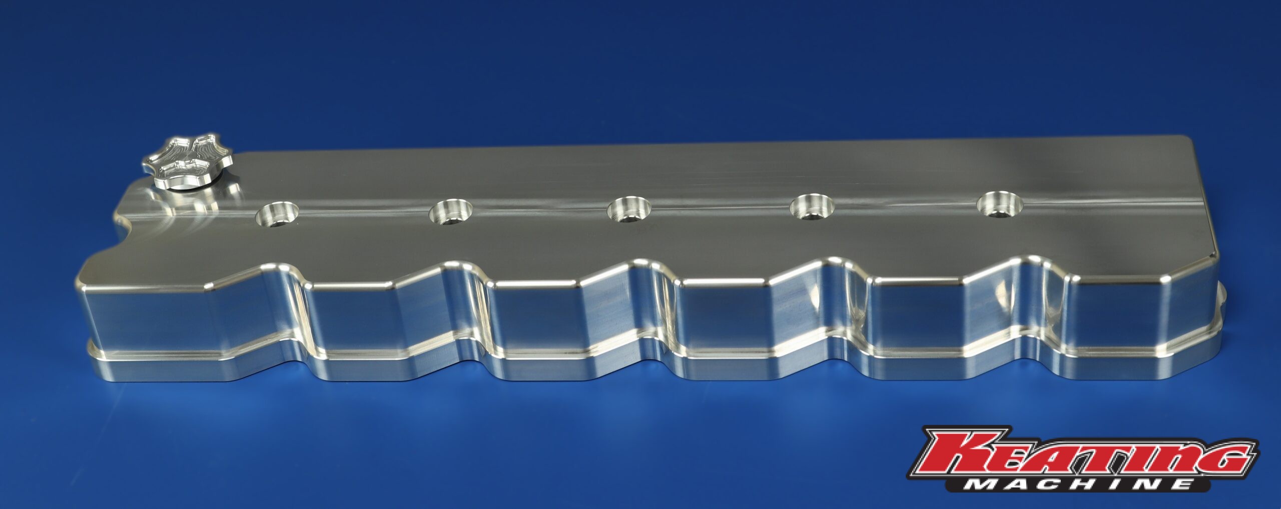 Stock height to fit in truck without modifying cowl. Total height is 2.95″. Fits mid-1998 to 2002 24 Valve engine. Billet Valve cover machined in-house, includes o-ring sealed billet oil fill cap. Starts as 62 pound block of aluminum, that is approximately 10 pounds finished. Contact us before ordering if you want a valve cover engraved with the Keating Machine logo or another logo on top. Requires stock valve cover gasket (not included). Does not come with any hardware other than fill cap. Uses stock mounting bolts. If you plan to run top feed injectors fed through the top of the valve cover we recommend ordering the extra tall version of this cover available here https://keatingmachine.com/product/24-valve-billet-valve-cover-1998-5-2002-fits-cummins-extra-tall/
